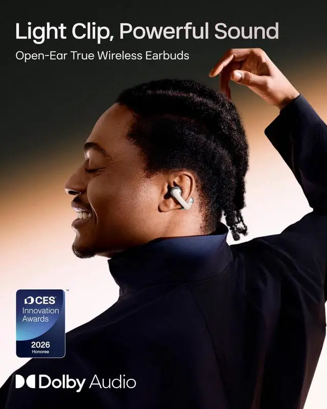 Personalized Clip-On Fit - The flexible nickel-titanium plate and soft silicone grip conform to your ear for security and comfort. At just 6.5 g, each earbud is virtually unnoticeable through all-day wear. ^^ Rich, Open-Ear Audio - Shokz signature open-ear design keeps you connected to the world while you experience the pocket-sized power of OpenDots ONE's premium Dolby Audio and Bassphere Technology. ^^ Mini Size, Mighty Features - Each earbud is interchangeable between your left and right ear, equipped with optimized microphones, IP54 water resistant, and built with DirectPitch tech to minimize sound leakage.