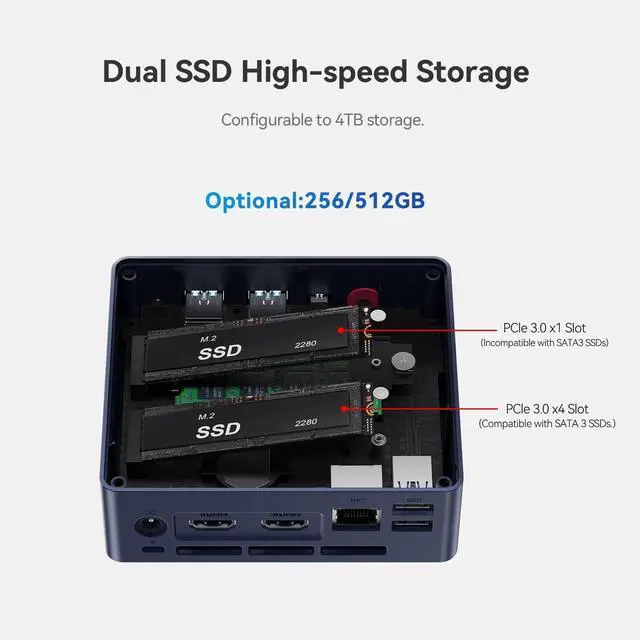 16G DDR4 and 500G SSDBeelink MINI S13 N150 mini desktop computer has built-in 16GB (Single-channel) DDR4 and 500GB M.2 SSD. For storage freedom, you can add a PCle 3.0x4 slot for M.2 SATA III SSD (not included) to expand it to 2TB; you can upgrade the internal storage to 4TB with two SSDs, allowing you to expand freely as needed and store more data files