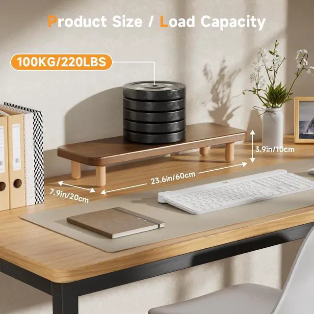 Space-saving Desk Organizer with StorageMeasuring 23.62" L 7.9" W 3.94" H, this Monitor Stand Riser offers ample under-monitor storage for your laptop, books, and essentials, transforming clutter into order. It's the ultimate Desk Organizer that efficiently clears your workspace, and it also functions perfectly as a stable Laptop Stand, keeping your device secure and elevated. ^^ Sustainable & Premium Monitor Stand RiserCrafted from eco-friendly, high-quality wood compliant with environmental standards, our Monitor Stand Riser combines durability with a green conscience. This commitment to quality ensures that your Desk Organizer with Monitor Stand is not only good for your workspace but also for the environment.