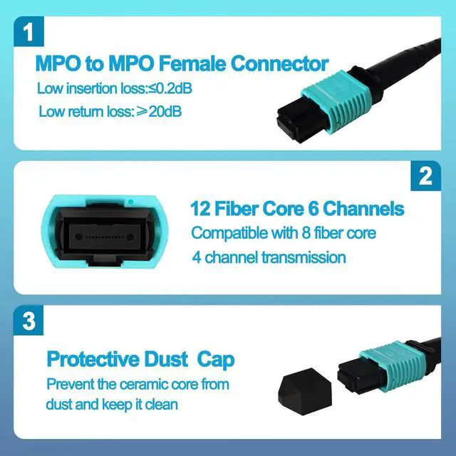 Product Description-All the data were tested with high-precision instruments-MPO jumpers are widely used in the environment where high-density integrated optical fiber lines are needed in the wiring process, and the internal and external connection applications of FTTX, 40/100G SFP, and other transceiver modules or devices.