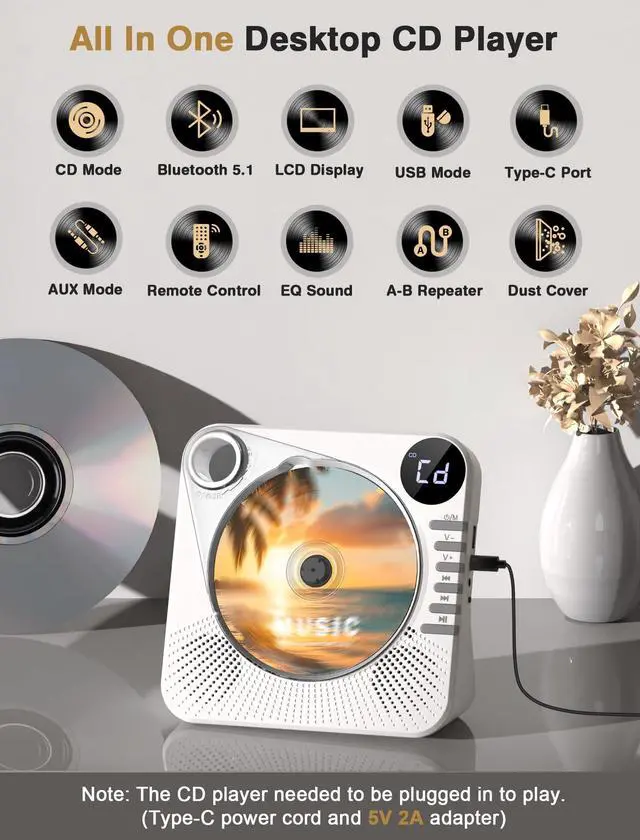 Dual Stereo Speakers: Ideal for backyard parties or cozy nights in, this bluetooth CD player with speakers delivers rich, room-filling sound. The HIFI stereo design balances crisp vocals and deep beats, perfect for classic, rock, flat, POP, or jazz. What a wonderful CD player for home it is, just call some friends to enjoy the happy time with this desktop CD player. The CD player requires a 5V2A adapter to be plugged in for use. (5V2A adapter not including) ^^
