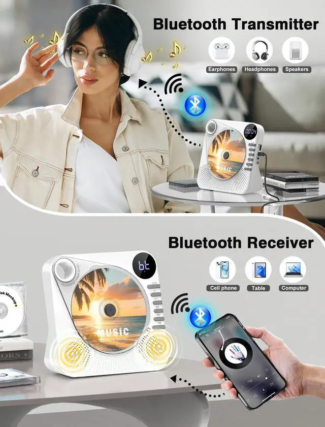 All-in-One Desktop CD Player: Ideal for daily commutes, workouts, or outdoor adventures, this bluetooth CD player supports CD/MP3/CD-R/CD-RW formats and doubles as a USB drive music player. Plug in any 3.5 mm headphone for private listening, or enjoy a USB playback for your favorite playlists. This lightweight, anti-skip design ensures your music stays smooth even during movement.