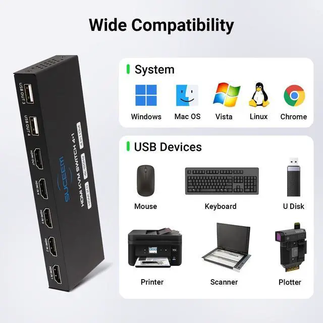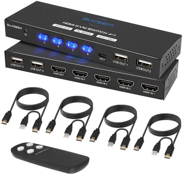 Of course, it also supports backward compatibility with 4K@30Hz, 2K@60Hz, 1080P or lower resolutions. ^^ Plug and PlayThe HDMI KVM Switch features Adaptive EDID, ensuring stable and smooth image transmission by automatically optimizing display settings on your monitors. ^^ Complete PackageThe package includes everything you need for seamless setup: 1*KVM Switch, 4*Professional KVM CablesUSB/HDMI 2-IN-1, 1*Wired controller, 1*Remote control, 2*AAA batteries, 1*User manual