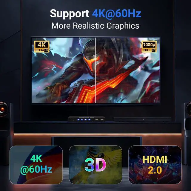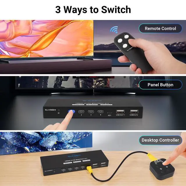 4-Port HDMIThe HDMI KVM switch allows you to control up to 4 computers sharing 1 HD monitor and 4 USB 2.0 devices such as printers, mouse, keyboards, U disks and more. ^^ 3 Switch ModesRemote control and wired desktop controller is included. You can easily switch between 4 computers using the remote control or switch button or wired desktop controller, the LED indicator will show the incoming devices. ^^ Ultra HD 4K@60HzSupports ultra-wide screen display, DDC and automatic recognition of high-quality output. With a resolution of up to 4K@60Hz, Fine and realistic images with vivid colors give you a visual feast.