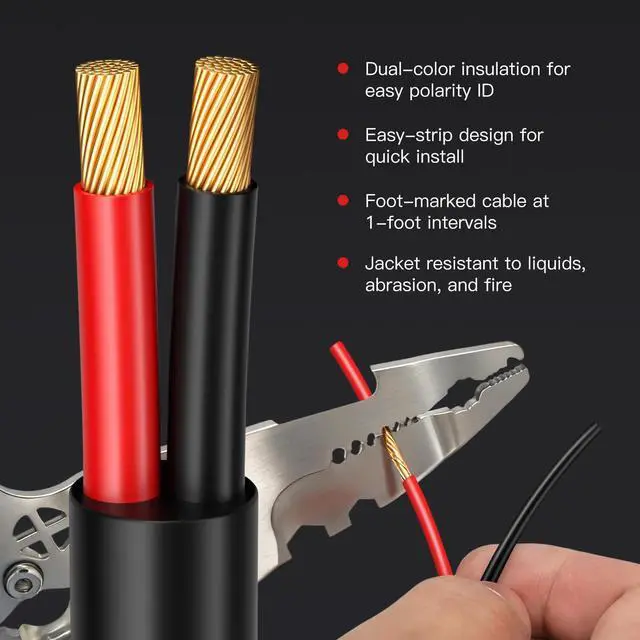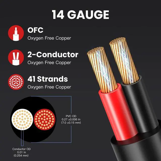 Deep Burial Performance Heavy duty PVC withstands soil moisture and pool splashes supports 24 inch burial without conduit for permanent outdoor installations ^^ Advanced UV Defense Carbon reinforced jacket provides 3 times longer lifespan resists sun damage in gardens and patios ^^ Precision 41 Strand Oxygen Free Copper (OFC) ensures minimal signal loss with corrosion resistance for crystal clear outdoor audio ^^ Mud Proof Polarity Coding Thick red black stripes visible in dirty conditions ensures accurate connections ^^ Dual Safety Certified CL3 andcompliant materials 158 ignition point for safer burial near structures