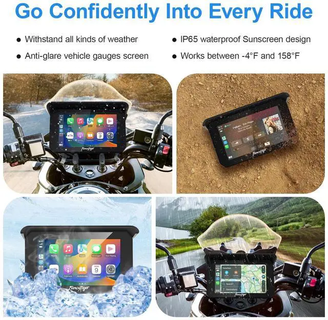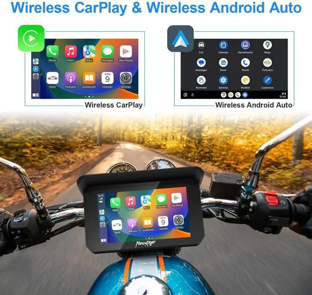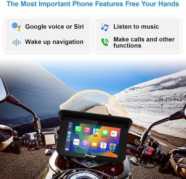 Motorcycle Carplay & Motorcycle Android AutoOur FancyTiger motorcycle carpaly has Apple CarPlay or android auto functionality. By wirelessly connecting your smartphone to your motorcycle's touchscreen via Bluetooth, you can access map navigation, phone calls, music playback, text messaging, and more with the help of Siri or Google Assistant. Keeping your hands free allows you to focus on the road and ride safely. ^^ Built-in BluetoothFancyTiger newest motorcycle GPS carplay features built-in Bluetooth connectivity, pair the carplay touch screen with your smartphone and Bluetooth-enabled headphones or helmet, you can make hands-free calls or enjoy your favorite music, without take off your helmet.
