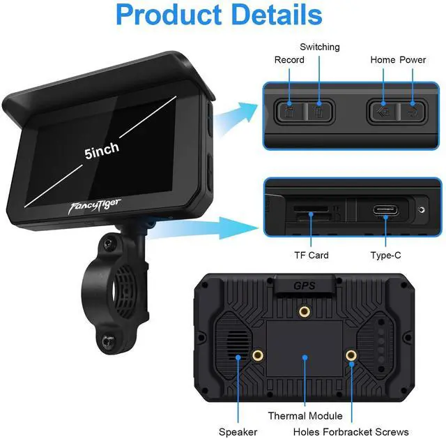 Not only keeps your phone safely in your pocket but also allows you to enjoy a free riding experience. ^^ Stunning HD DisplayImmerse yourself in the brilliant 5-inch high-definition IPS screen. With a resolution of 854x480, every detail comes to life. The vibrant 65K colors and peak brightness of up to 800nit deliver a clear and captivating viewing experience, even under direct sunlight. ^^ Waterproof DesignFancyTiger 5" IPS motorcycle GPS touch screen is IP65 waterproof design, no matter the weather conditions, our IP65 waterproof motorcycle navigator can handle it all. From heavy rains to scorching sun, its durable design ensures reliable performance.