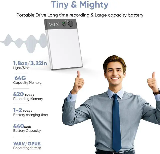 All recordings are encrypted in Google Cloud, ensuring data security. Moreover, the device does not use your recordings to train ChatGPT models, ensuring your privacy is fully protected. ^^ Precise Recording & Noise CancellationWJX features a dual-engine recording system. The air conduction sensor captures high-quality audio for meetings and presentations, while the vibration conduction sensor ensures crystal-clear call recordings. Advanced noise reduction technology filters out up to 90% of background noise, ensuring top-notch audio quality. Dual omnidirectional microphones support 98% transcription accuracy for clear and precise recordings. ^^ Compact, Portable, and Magnetic DesignLightweight (40g) and only 0.2 inches thick, the WJX is highly portable.