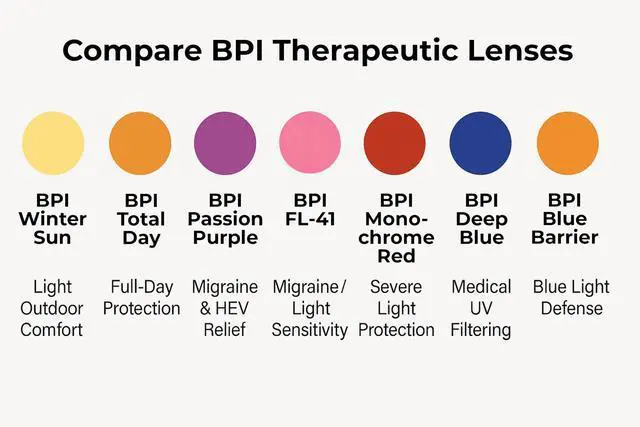 FL-41 Rusty Rose Pink Lenses: Block flickering blue light to help alleviate migraines and eye strain, providing a soothing effect for indoor lighting & sensitive settings. Winter Sun Light Golden Yellow Lenses: Brighten your day with improved contrast & energy levels. Practical for outdoor activities under low light.