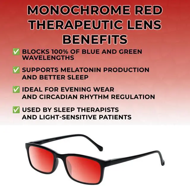 • Monochar Deep Red Lenses: Enhance your emotional well-being with Monochar Deep Red lenses designed to promote feelings of happiness, sociability, and confidence through color therapy. These versatile glasses may help reduce light sensitivity, alleviate migraine symptoms, and shield eyes from LED and fluorescent lighting. Ideal for professionals like dental assistants, offering potential relief in bright settings while serving as blue light-blocking and UV-protective eyewear.
