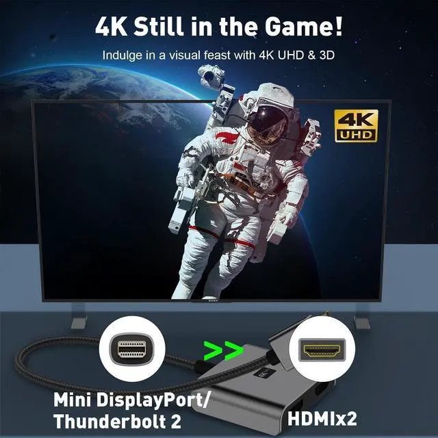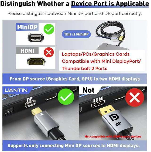 *Note: Please note the product port distinction; this is a Mini DisplayPort interface. For Mac devices, only mirroring is supported; extended multi-display is not supported ^^ 4K 60Hz Ultra HDThe UANTIN Mini DisplayPort to HDMI adapter supports 4K@60Hz ultra-high definition resolution, providing smooth images without blurring and accurately reproducing every detail to deliver cinema-quality picture quality. Whether it's high-definition movies, design drawings, or game graphics, it eliminates lag and tearing to provide a smooth and seamless visual experience. ^^ Durable and Stable Thunderbolt 2 to 2 HDMI adapter adopts gold-plated plugs that are oxidation-resistant and corrosion-resistant to ensure lossless signal transmission; paired with a high-quality aluminum shell, it has strong heat dissipation and is wear-resistant and shock-resistant, effectively shielding electromagnetic interference, eliminating screen flickering and black screen issues, and extending service life. ^^ Seamless Multi-Device Connectivity The Mini DP to HDMI cable requires no drivers and no external power source! Effortlessly connect devices with a Mini DP port to an HDMI display. Compatible with Apple MacBook Air (2009-2017), Apple MacBook Pro (2009-2015), iMac (2009-2015), Microsoft Surface Pro 1-6, Surface Laptop 1-2, Surface Book 1; The Mini Display to HDMI adapter supports Mini DP/Thunderbolt 1/2 output, enabling smooth high-resolution audio and video connections.