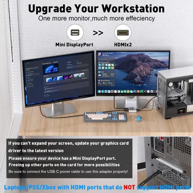2-in-1 Mini DisplayPort to Dual HDMI AdapterThis Mini DP to 2 HDMI adapter makes it easy to connect a source device equipped with Mini DisplayPort/Thunderbolt 2 to two HDMI displays, thus increasing your efficiency and creating more possibilities for you. It also supports mirroring mode (SST) as well as extended mode (MST).
