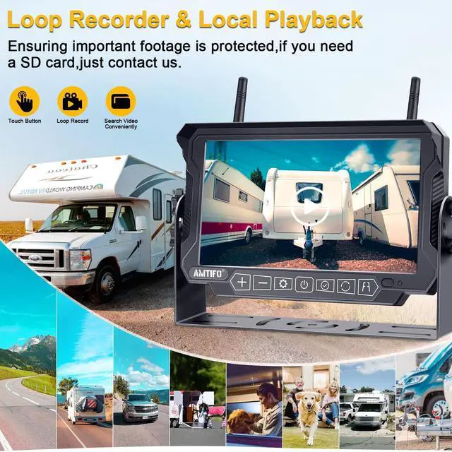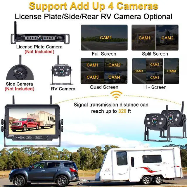 Latest & Stable Signal: The back up camera for trailer upgraded unique digital signal dedicated dual antenna, power, transmission distance, stability, durability are improved by at least 50%. RV backup camera wireless can send hd 1080P videos to the display via the stronger signal. The signal can reach up to 984 feet in open areas and works in vehicle ranges up to 320 feet. ^^ DVR Recording Function & Multiple Split Screen: Travel Trailer backup rearview camera built in record function and loop recording, continuous record when memory card is full and auto erase old files. Truck hitch trailer backup camera wireless with display has four channels and you can add four cameras at the same time for front, back, and side to eliminate blind spots.