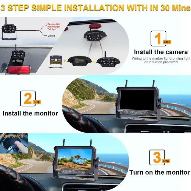 ^^ Parking Safely: With the wireless backup camera for truck rv, you can park your car easily when you are parking on camping ground. The rv rear camera wireless with monitor can adjust the width of the parking line, move the parking line left/right/up/down so that it reflects the real situation, even turn on/off the parking guide line according to your preference.