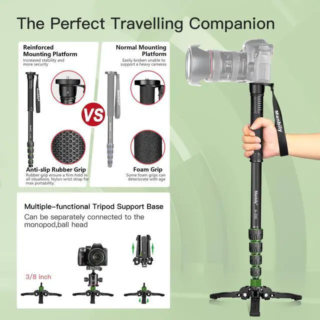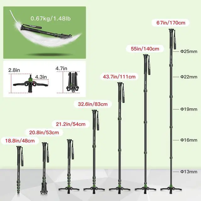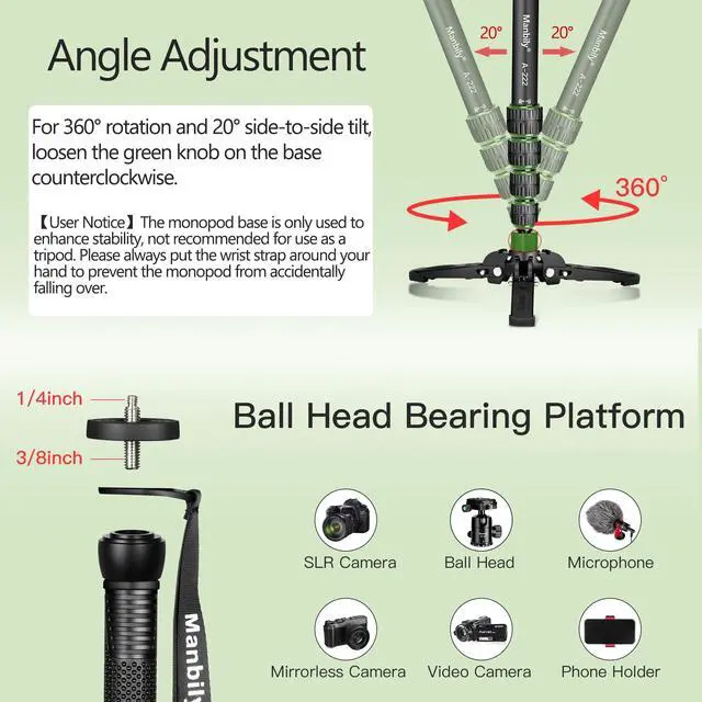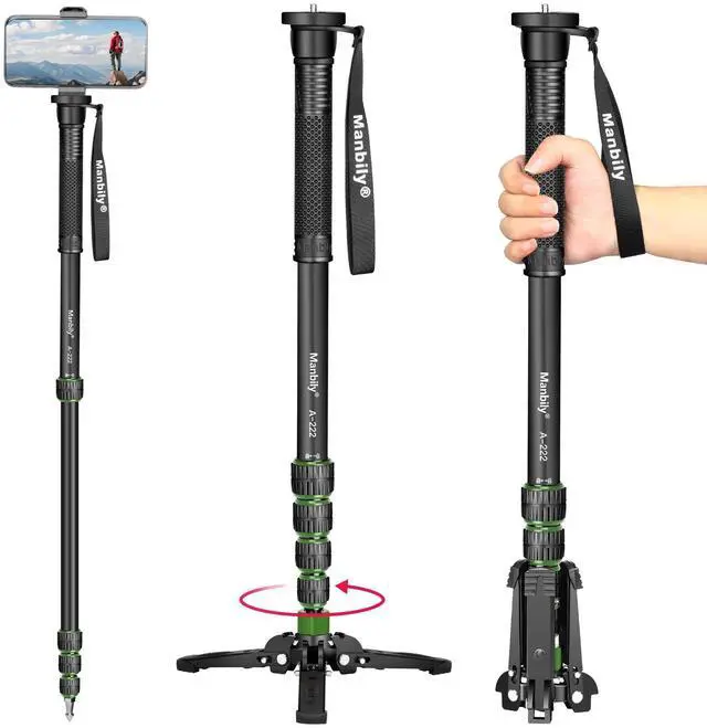 Brand: ManbilyModel: A-222Minimum Height: 67in / 170cmLoad Weight: 15.5 lbs / 7kgMaterial: Metal AluminumProduction Process: CNC ProcessPacking List: 1 x Monopod1 x Support Base1 x Metal Spikes1 x Phone Clip1 x Allen Key1 x Manual