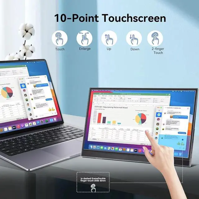 Touch Screen: This portable monitor features a 1920x1200P resolution with touch capability, providing a responsive and interactive display for gaming and working on your laptop or computer. To use the touchscreen, ensure your device is connected to the Type-C data port of the monitor, not the DC Type-C charging port. The portable touchscreen monitor ports are labeled. No extra drivers are required. Please note that macOS only supports single-point touch. iPhones, and iPads do not support touch functionality.