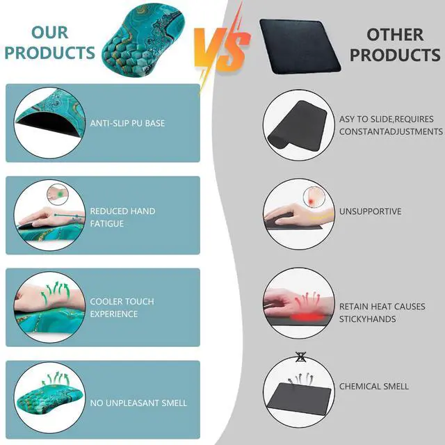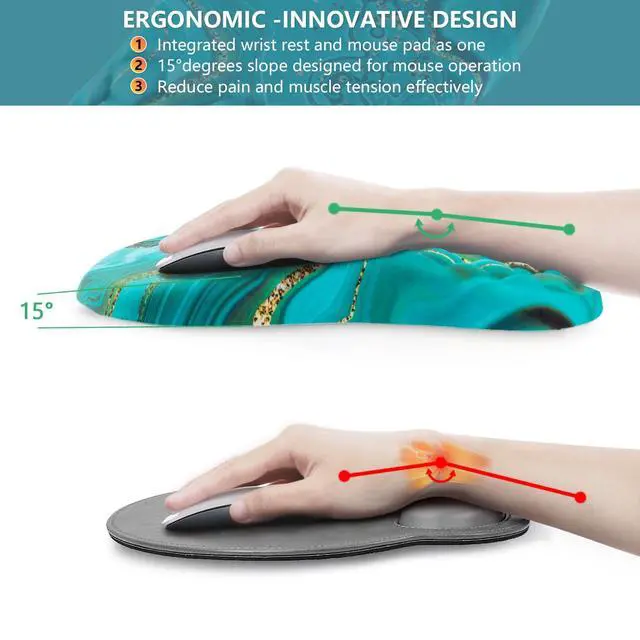 Ergonomic Mouse Pad the mouse pad is made of 100% memory foam, and the tilt angle on the surface can keep your arm always in the in proper alignment. The ergonmic structure of the arched part provides the maximum comfort to your wrist, and prevents the carpal tunnel syndrome ^^ The Super Smooth Surfacemousepad the covering is the smooth fabric, high-quality Lycra cloth, which won't irritate to skin. The premium comfortable material allows the smooth mouse glides and accurate mouse tracking movement. It suits most of mice, such as wired, wireless, optical, and mechanical mice ^^ Non-slip Silicone Basethe bottom of the mouse mat is made of the silicone, so that the pad can be fixed at any desktops.