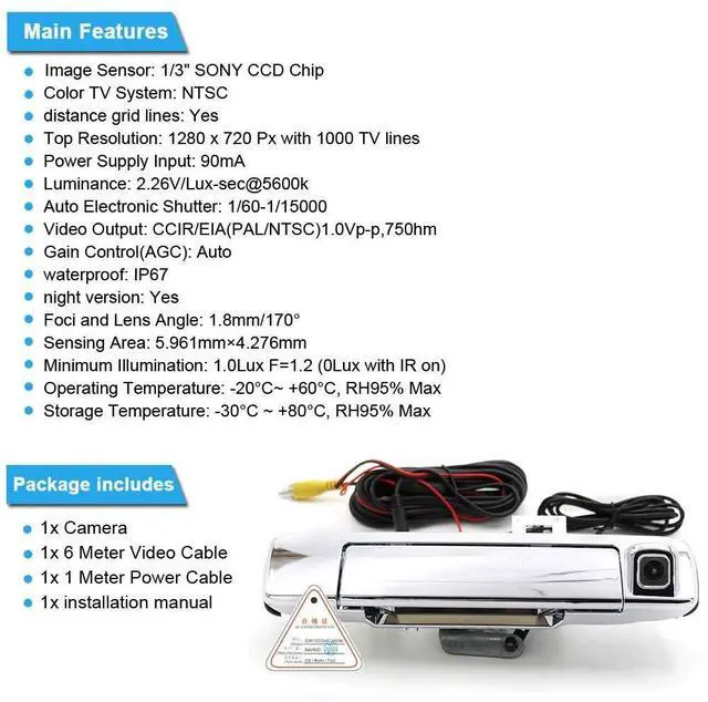 Working temperature: -40~ 70/ -40~ 158Package Contents1 x Car Rear view Camera1 x Power Cable ( 1.5 m/ 4.9 ft)1 x AV Cable (6m/19ft)1 x User Manual