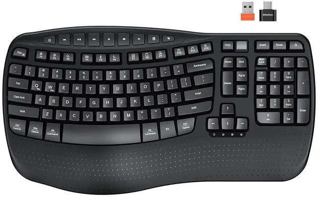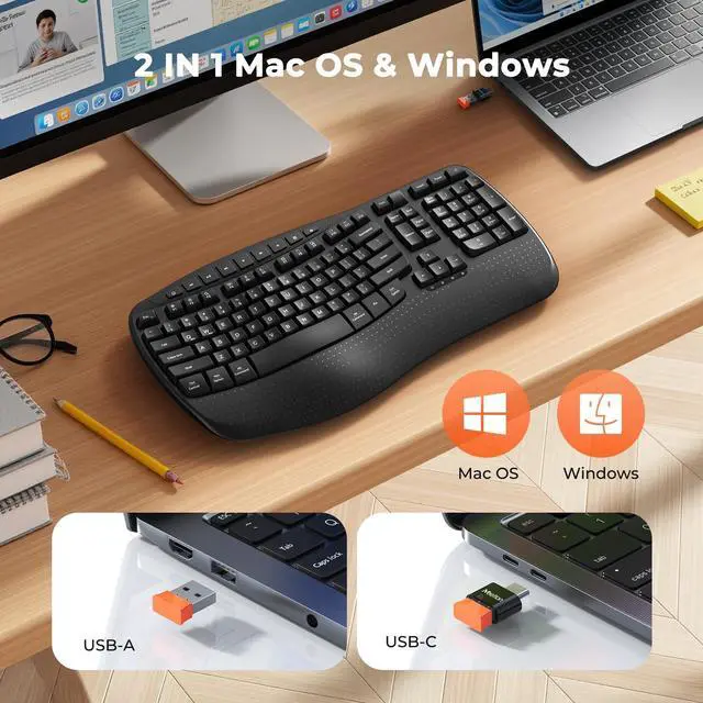 (Please note: This is not a soft, padded wrist rest. ). ^^ RELIABLE CONNECTIONWith the familiar traditional key layout and 2.4GH z wireless receiver, it is truly plug and play, easy to plug in and start working efficiently (This is not a Bluetooth device). The USB-A receiver is located in the slot inside the keyboard's battery compartment, and the UAB-C adapter is in the accessory pouch inside the box. Be sure to check all the accessories carefully, and don't throw away the box in case you lose the important accessories, which may affect the use! ^^ INTELLIGENT POWER SAVINGThe ergonomic keyboard runs entirely on battery power and requires 2 AAA batteries (not included). It comes with an auto-sleep mode: it will automatically enter hibernation after 20 minutes of inactivity to reduce power consumption, effectively extending battery life. To resume use, simply press any key to wake it up instantly. ^^ DUAL SYSTEM LAYOUTThis curved keyboard has a dual system layout for Mac and Windows and is compatible with any device with a USB-A or USB-C port. You can easily switch between Windows and macOS by pressing FN+Q or FN+W. Compatible with Windows XP/7/8/10/11 & macOS X 10.6 or later. Not compatible with Linux, Chrome OS, iOS, Android, Smart TVs, or tablets without a full USB port.
