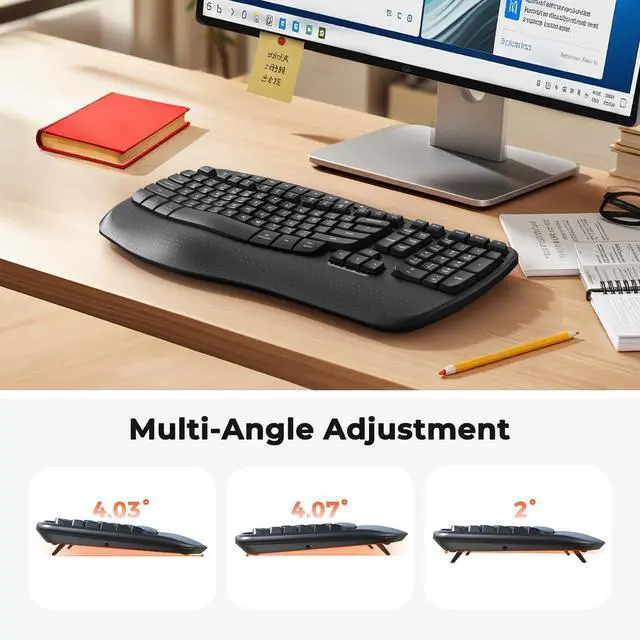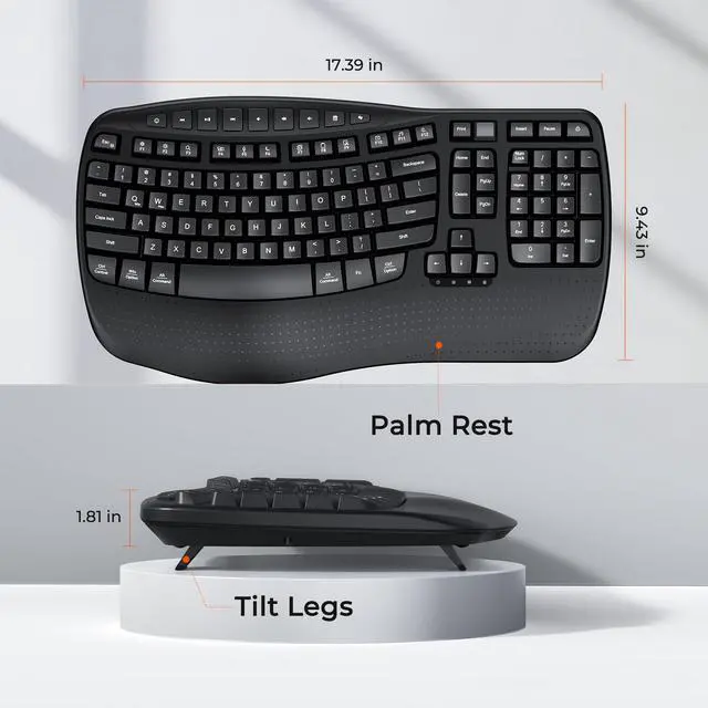 ^^ NEW ERGONOMIC DESIGNOur wave keyboard combines the advantages of ergonomics and retains the familiarity of traditional keyboards. Therefore, you don't need to spend extra time adapting to a new typing method. Say goodbye to the complex learning curve of split keyboards. Even users who are new to ergonomic keyboards can quickly get the hang of it. You can enjoy a comfortable typing experience without compromising your work efficiency. ^^ WIDE PALM REST OFFERS MORE SUPPORTThe wireless keyboard is features a built-in hard plastic wrist rest that provides stable supportdesigned to keep your wrists comfortably aligned.