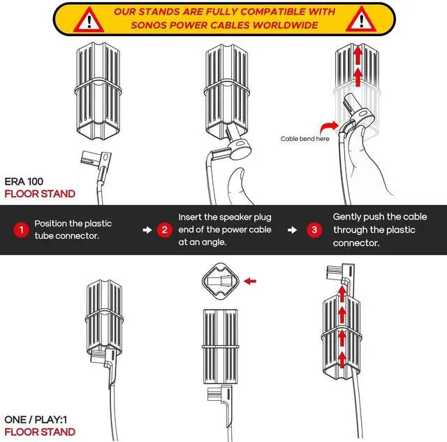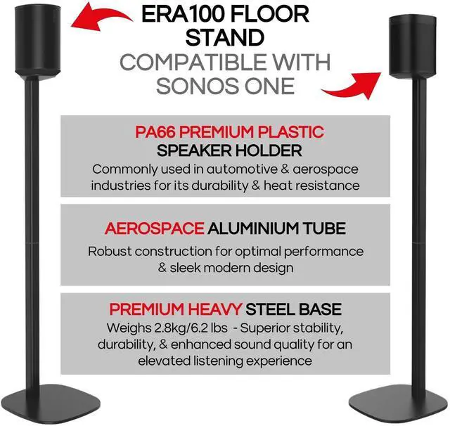 DUAL-COMPATIBILITY WITH SONOS SPEAKERS: Our floor stands are thoughtfully designed to support Sonos One, Sonos ERA100, and ERA 100 SL speakers. This feature ensures long-term usability and adaptability, making our stands a valuable addition to your evolving audio system.
