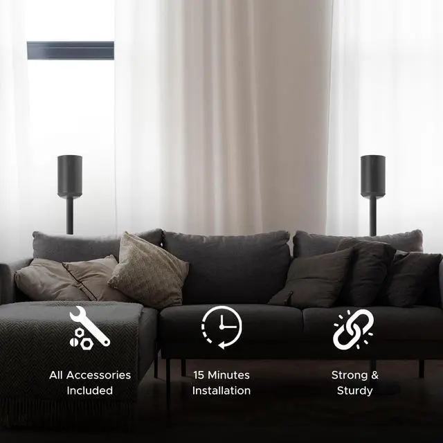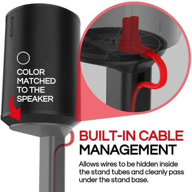 EXPERTLY DESIGNED FOR OPTIMAL HEIGHT: Elevate your Sonos ERA100 or ERA 100 SL with our floor stand to the ideal height of approximately one meter (36 3/4 inches), perfectly positioning the speaker above your sofa. This height aligns the speaker's sound output with ear level for an immersive audio experience. ^^ SLEEK DESIGN WITH INTEGRATED CABLE MANAGEMENT: Our floor stand's compact and minimalistic design fits seamlessly behind sofas or as a standalone piece. It features a built-in cable management system, ensuring a clean and organized look that enhances both aesthetics and functionality in your audio setup. ^^