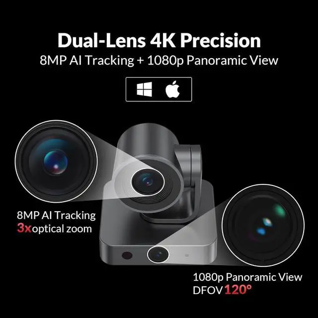 4K Dual-Lens Precision 8MP AI lens (3x optical zoom, 110 FOV) + 1080p panoramic lens (120 FOV) for seamless tracking and immersive conference views. ^^ Exclusive AI Gallery Technology Individuals Gallery detects and frames each participant (up to 4 people), showcasing facial expressions clearly. Automatically switches to group framing for larger meetingsa feature unique to BizEye. ^^ Presenter Tracking & Auto-Framing AI locks on speakers and adjusts frames dynamically for natural interactions. ^^ Easy & Flexible Installation Plug and play with included mount for quick setup on top of or below a display, or on a wall.
