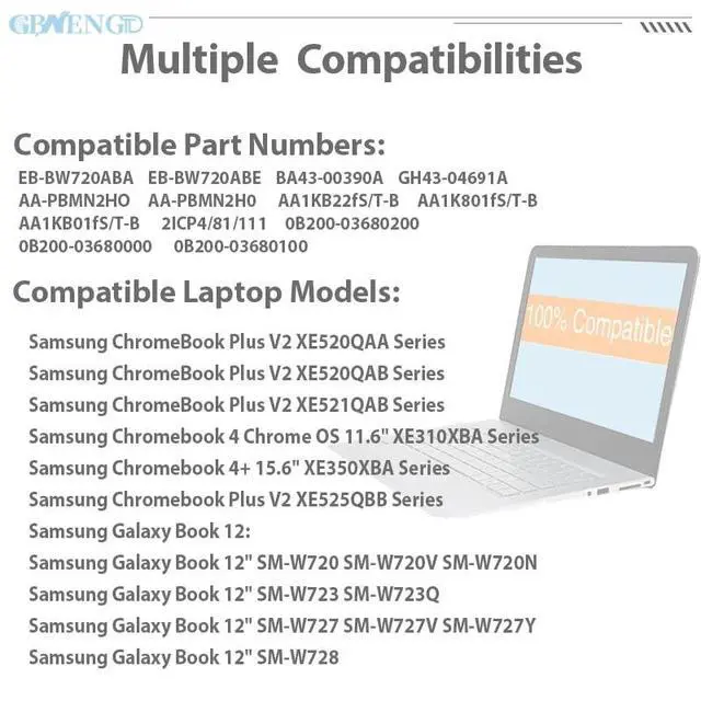 Battery Condition: 100% brand New from Manufacturer. ^^ Compatible Model Fit for Samsung Chromebook Plus V2 XE310XBA XE520QAB XE350XBA XB521QAB XE525QBB XE310XBA-K01US XE310XBA-K02US XE310XBA-K03US XE310XBA-K04US XE310XBA-K05US XE350XBA-K01US XE350XBA-K03US XE350XBA-K02US XE350XBA-K04US XE350XBA-K05US XE520QAB-K02US XE520QAB-K01US XE520QAB-K03US XE520QAB-K04US XE520QAB-K05US XE521QAB-K01US XE521QAB-K02US XE521QAB-K03US XE521QAB-K04US XE521QAB-K05US; Galaxy Book 12 SM-W720 SM-W720V SM-W720N SM-W723 SM-W723Q SM-W727V. ^^ Compatible Part No# EB-BW720ABA, EB-BW720ABE BA43-00390A, GH43-04691A, AA-PBMN2HO, AA-PBMN2H0, AA1KB22fS/T-B, AA1K801fS/T-B, AA1KB01fS/T-B, 2ICP4/81/111, 0B200-03680200, 0B200-03680000, 0B200-03680100 ^^ Quality First We have passed a series tests of short circuit, overheating, and overload protection before shipments. The newest generation chips, grade A cell battery, provide long cycle life, stable performance and broad compatibility. ^^ Service First-rate We promise 30-Day Refund & 1-Year Warranty. For any battery questions, just feel free to contact us for help via the order or click on"GBNENGTD", then you can see "Ask a question" on the page. We are here to serve for you for any battery problems within 24 hours.