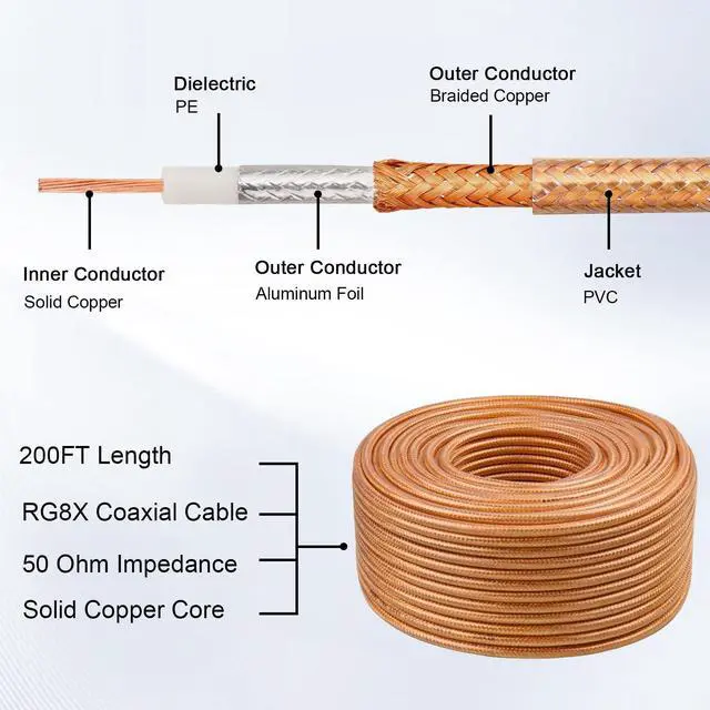 200FT RG8X Coaxial Cable, 50 Ohm Low Loss, Solid Copper Conductor, Durable Shielding with PVC Jacket, Ideal for Antennas, Ham Radio, CB Radio, and RF Applications