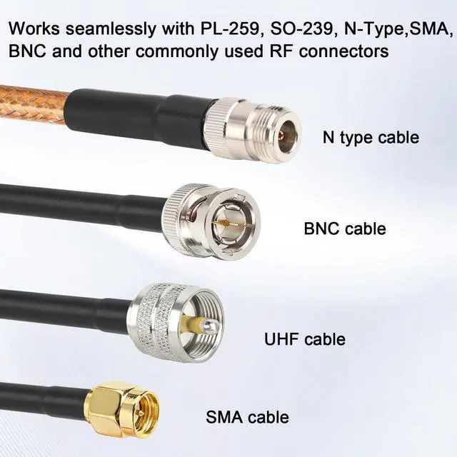 • Wide Frequency Compatibility Works seamlessly with PL-259, SO-239, N-Type, and other commonly used RF connectors, supporting frequencies up to 600 MHz and 50 Ohm impedance for diverse high-frequency applications.