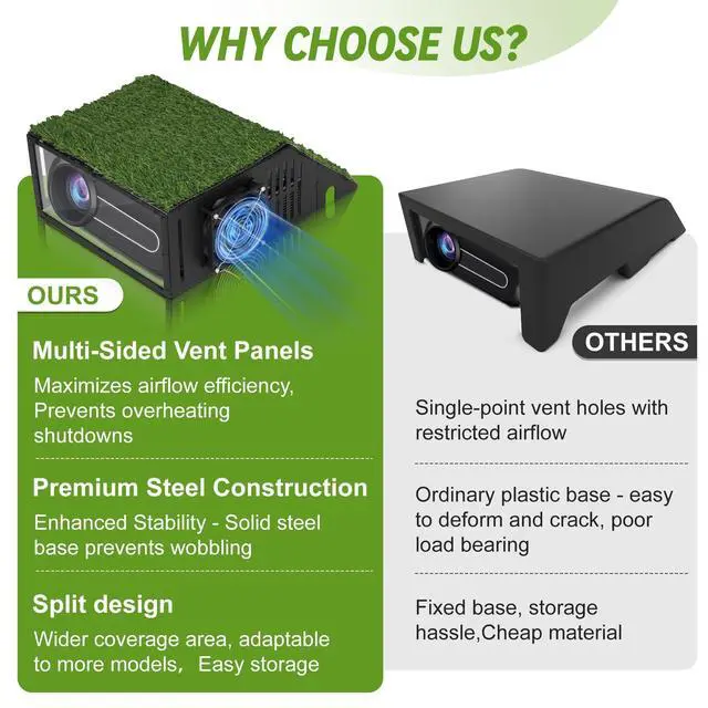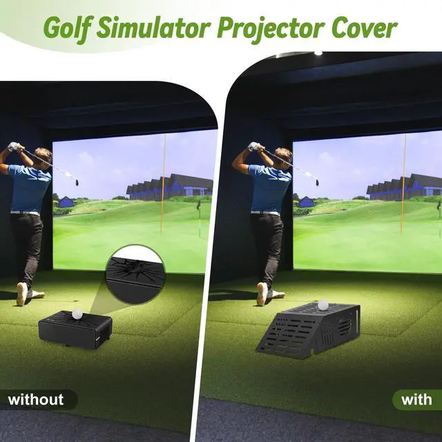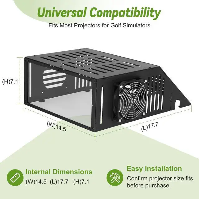Golf Simulator Projector EnclosureA practical and cost-effective alternative to ceiling mounts. This floor-mounted projector cover lets you conveniently position your golf simulator projector on the ground while providing reliable protection from impacts and mishaps. ^^ Strong Metal Frame & Cable ManagementCrafted with a heavy-duty steel frame and a durable polycarbonate panel, this enclosure ensures long-lasting strength and protection without affecting image clarity. Built-in power cord openings help prevent pinching and keep cables organized. ^^ Universal FitDesigned to accommodate most standard golf simulator projectors. Please confirm that your projector fits within the internal dimensions: 14.5" (L) x 17.7" (W) x 7.1" (H). ^^ Efficient Ventilation SystemEquipped with side and top ventilation ports plus cooling fan, The golf projector floor enclosure promotes optimal airflow and heat dissipation to maintain projector performance during long practice sessions. ^^ Quick & Easy AssemblyBenut floor mounted Projector Cover Comes with clear instructions and all necessary tools, allowing for fast installation and secure setup. ^^ Remove Protective Film Before Use Peel off the acrylic protective film to achieve crystal-clear transparency and the best projection brightness.