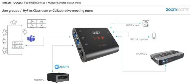 TOGGLE USB AV Professional Switcher connect to three USB 3.0 devices (Camera, microphone or speakers) and can switch them between two hosts (Room PC, CODEC or Laptop). It will switch automatically to a laptop when it is connected, and revert back to the room PC when disconnected. It can also be controlled remotely by RS-232 or GPI. Designed and Made in CANADA