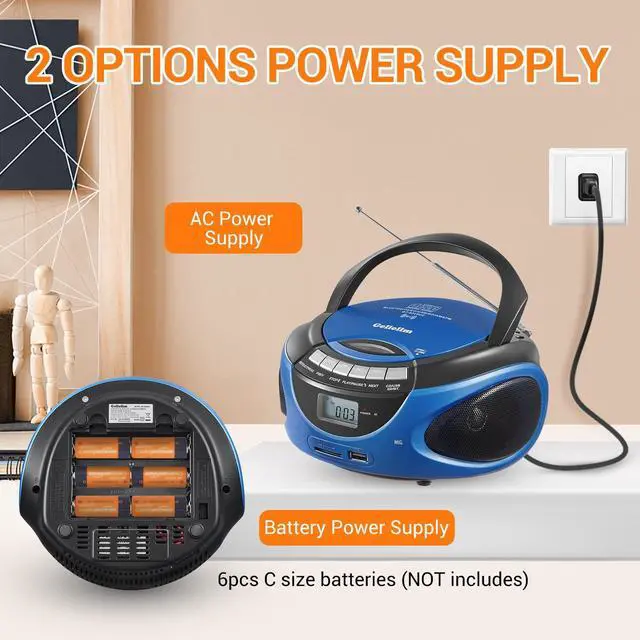 AM: 530-1710KHz, covering most broadcast stations. Powerful DSP chip and extendable antenna ensure excellent reception, allowing you to listen to radio anytime, anywhere ^^ [LOULD VOLUME & GRAET SOUND] Gelielim CD players for home construct with dual stereo speakers makes the sound more dynamic and clear. Lould volume design, even used outdoors, you can hear the CD player clearly, friendly to the elderly. Besides, we added a headphone jack that allows you to enjoy personal time. Multifunctional CD player boombox for daily use ^^ [2 OPTIONS FOR POWER SUPPLY] The portable CD player supports AC and battery power supply. Use the AC cable to charge this CD players for home in the kitchen, bedroom, or office; and use 6pcs C size batteries to supply power for picnics, walking, climbing, or gardening. Handle design allows you to take the boombox anywhere ^^ [IDEA