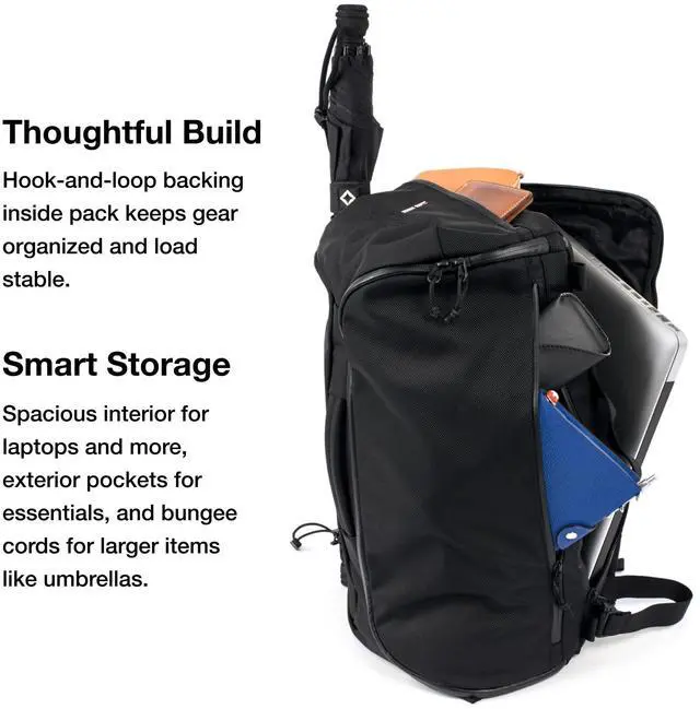 Thoughtful build. Hook-and-loop backing inside pack for customizable organization and load stabilization.