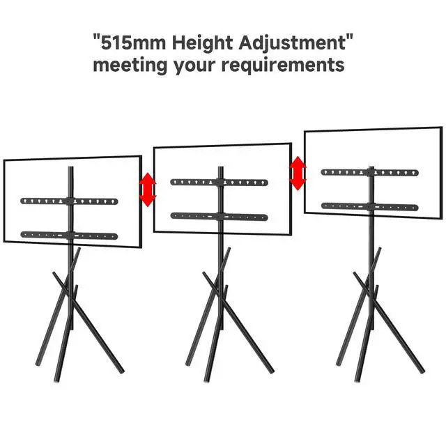Enjoy flexible viewing zones without permanent installation! Due to its structural and mechanical design, this stand must be placed with the single leg facing forward. Ensure that the double legs are never positioned toward the front. ^^ Adjustable Height + 90 Swivel for Custom Angles Optimize your view effortlessly! Raise/lower the screen across a 515mm height range and swivel 90 left/right to reduce glare. Reinforced 43mm steel hooks hold TVs securely at 13.6" (345mm) from walls. Ideal for landscape/portrait orientations. ^^ Industrial-Grade Stability with Tri-Leg Support Engineered for safety! The welded steel frame and triangular bracing distribute weight evenly.