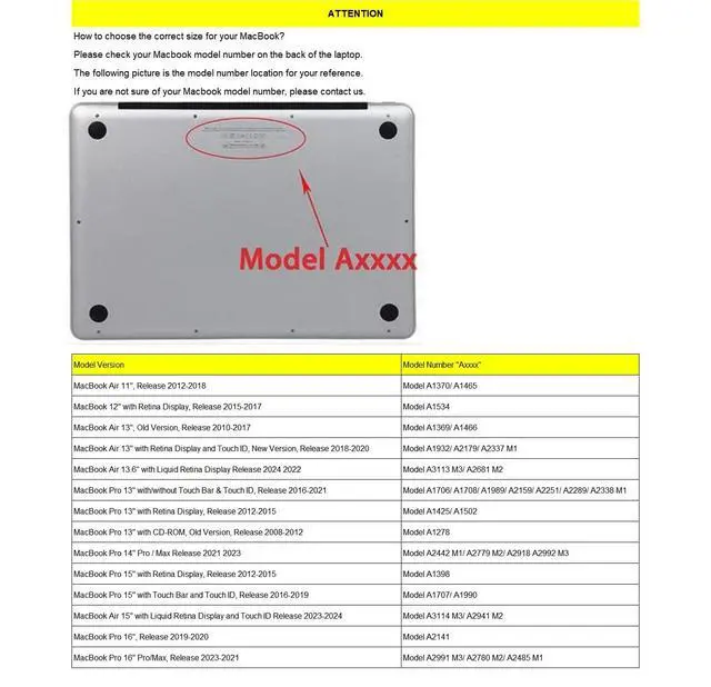 Shell Case: * Accurate incisions has full access to all ports and functions without removing the case. * Lightweight case, it will not bring extra weight to the laptop, easy to carry. * Designed with two rows of ventilation at the bottom, allowing safe heat dissipation. * Four anti-slip rubberized feet keeps your laptop firmly in place. * Design diversification to meet the needs and preferences of different groups. The size of the models is not exactly the same, how to choose the correct size for your macbook? The following way may help you confirm the model: 1. Turn your MacBook over. 2. The model number is located on the bottom of your MacBook, in small prints which says "Model: AXXXX". "XXXX" are numerical numbers. 3. Look carefully at the size options and choose the same model number as your laptop. If you have any questions about our products when purchasing, you could consult our customer service by email.