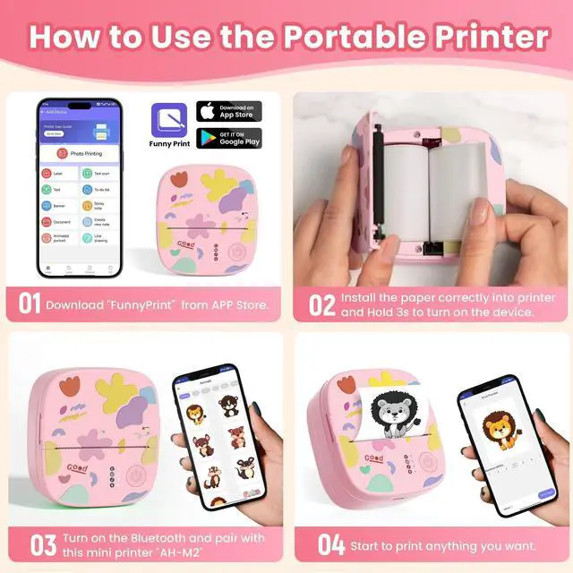 & Android: 1. Download the FunnyPrint app. 2. Long press the power button until the light flashes. 3. Connect to AH-M2 via Bluetooth and start printing! The app includes handy features like drag & zoom, OCR, templates, text tools, and fun stickers to unleash your creativity. ^^ Ultra-Portable for Any OccasionCompact and lightweight (only 0.26 lbs, 3.3 x 3.1 x 1.4 in), this mini printer easily fits into your pocket or bag. Take it anywhere school, office, travel, gym and print on the go! ^^ Fun for All Ages A Creative Gift IdeaWith its adorable, toy-like design, this create a sticker machine is fun, approachable, and perfect for all ages. Its a useful & creative sticker machine ideal for students, planners, scrapbookers, or anyone who loves to print photos and make memories. A great gift for birthdays, Halloween, Christmas, or any special moment. ^^ Worry-Free Guarantee & Friendly SupportWe offer a 2-year return and replacement guarantee for peace of mind. Any colored paper rolls or have questions about this mini thermal printer? Our customer support team is always ready to assist you ^^ For Best Results, Use Genuine XenGro Refill Rolls To ensure the best printing quality and to extend the lifespan of your printer, we recommend using original Xen Gro refill paper.