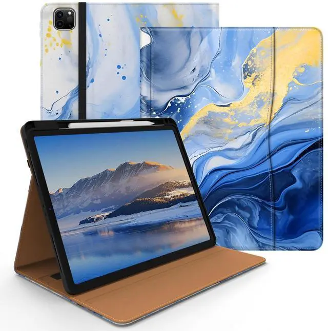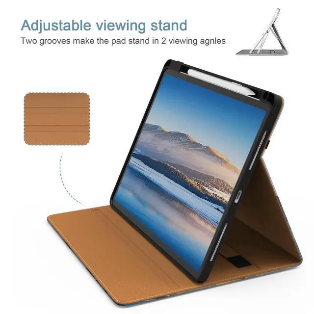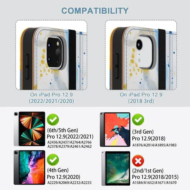 [Compatibility] Jarviwiin case only fit for iPad Pro 12.9 inch 6th 2022 /5th 2021 /4th 2020 /3rd 2019 (Model: A2436 / A2437 / A2764 / A2766 / A2378 / A2379 / A2461 / A2462 / A2229 / A2232 / A2233 / A2069 / A1876 / A1895 / A1983 / A2014). Not compatible with any other devices. ^^ [Full Protection] Made of durable Premium PU leather and soft TPU, front and back covered by soft Premium PU leather, the inside durable TPU can fix your iPad and protect its back cover and four corners, maximum protect your iPad from drop and scratch, the surface is soft and silky to provide a comfortable touch to the skin. ^^ [Multi Function] The front of the protective case is equipped with a pocket to keep cards, cash, and notes. And the case has a built-in pencil holder, which allows you to carry and protect your pencil wherever you go. (Pencils are not included) ^^ [Multiple Usage Scenarios] The protective case can have two grooves and a strap to keep the iPad at its most commonly used angle, making it easy for you to use in multiple scenarios, such as typing, video chatting, and watching movies. ^^ [Auto Wake/Sleep] Built-in hidden magnetic strip provides sleep/wake feature, save the energy in daily use.