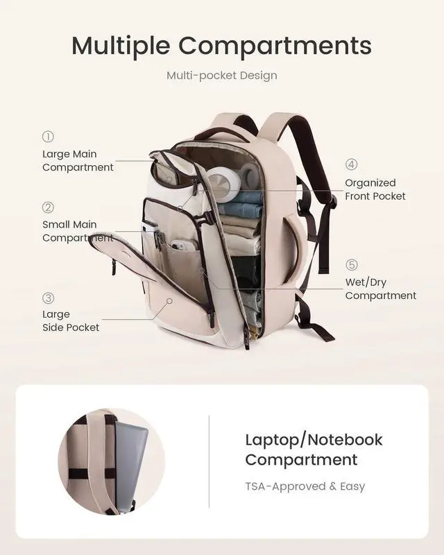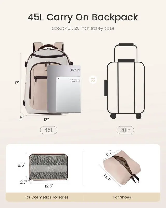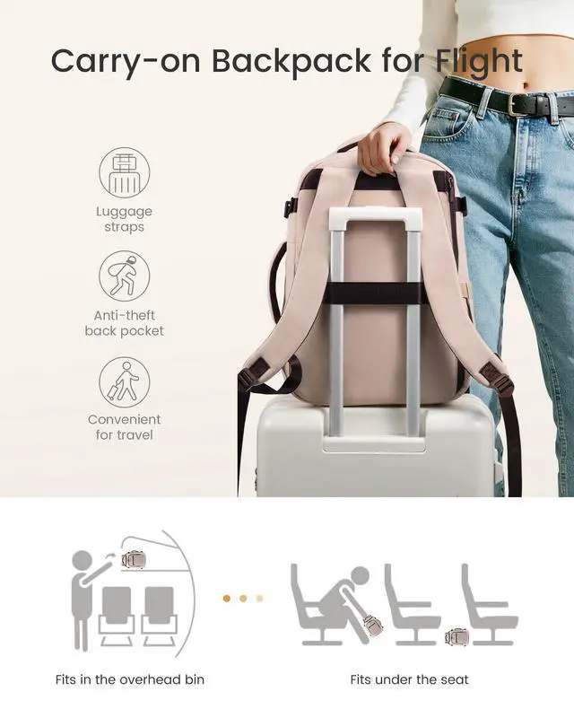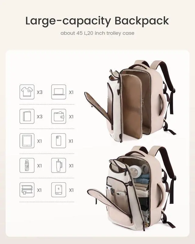 Large Capacity & Multiple PocketsThis travel backpack features a 40L large capacity and 5 main compartments, meeting the needs of daily commuting and travel. The main compartment of this women's travel backpack can store a variety of items, including 68 pieces of clothing and more. It also includes a separate dirty clothes compartment for easier organization. The dedicated laptop sleeve is padded with thickened EVA foam to provide secure protection for a 18inch laptop. ^^ Versatile Use & Airline ApprovedThis airplane backpack with dimensions of 13817 inches (approx. 332043 cm), this personal item travel bag fits perfectly under the seat in front of you or in the overhead bin.