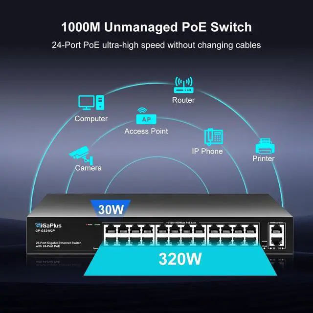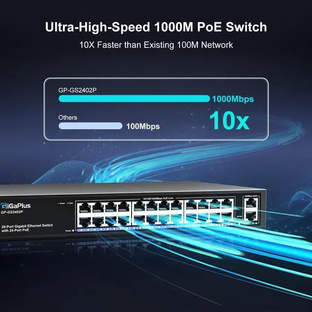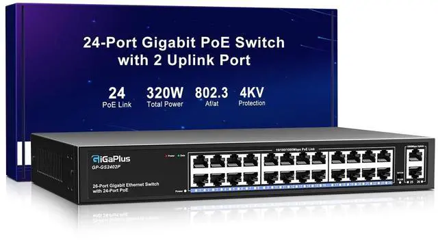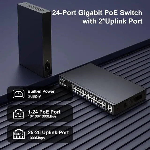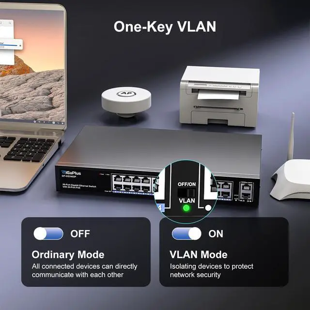 Port Gigabit PoE+ Switch: This 24-port Gigabit PoE+ switch features 24 PoE+ RJ45 ports and 2 Gigabit uplink ports for connecting to NVRs, the Internet, and more. With high-speed data transmission and power delivery over the network cable, it offers a reliable solution for your devices. ^^ One-Key VLAN mode for enhanced security: The 26-port power over ethernet switch features a One Key VLAN mode that isolates the 1-24 ports from each other while still communicating with the uplink ports, improving network security and bandwidth utilization.