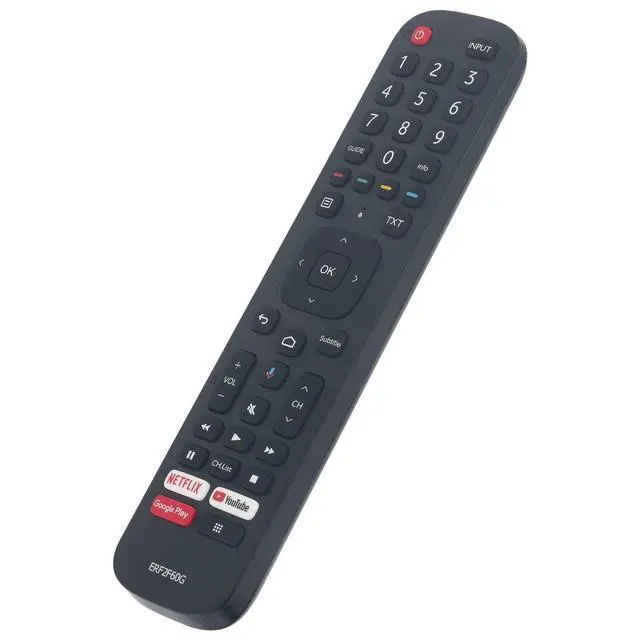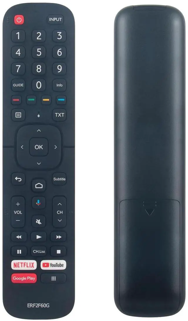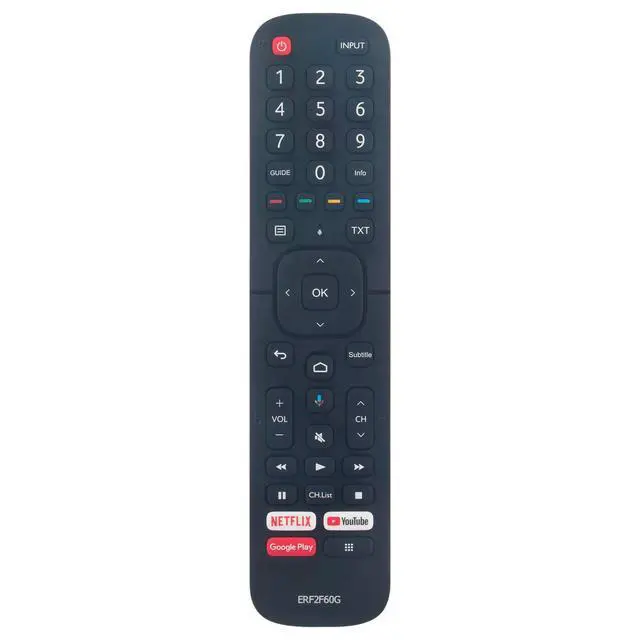 ERF2F60G sub ERF2B60H Replaced Voice Remote Commander fit for Hisense Full HD LED Smart Android TV. ^^ Compatible with Hisense Smart Android TV 9.0 Pie A56E 32A56E 40A56E 50H6510G 50H6570F 50H8G 50Q7G 65A6501EU 50A6501EU 55U6EU 65U6EU HU100L5 HU120L5 50H78G 55H78G 70H78G 85H78G 43H78G 58H78G 65H78G 75H78G 32H5500F 32H56G 40H5500F 40H5609 40H56G 43H6570F 50Q8G 55H9F1 55H9G 55Q7G 65H8G 55H9030F 55H9040F 65H9F1 65H9G 65Q7G 65Q8G 65Q9809 65Q9G 75H6510G 75H8G 75Q7G 75Q8G 85H6510G H6590 32H5520F 32H5530F 32H5540F 32H5550F ^^ 32H5560F 32H5570F 32H5580F 32H5590F 40H5520F 40H5530F 40H5540F 40H5550F 40H5560F 40H5570F 40H5580F 40H5590F 43H6590F 55H6510G 55H6570F 55H8030F 55H8050F 55H8090F 55H8809 55H8G 55H9020F 50H8F 55H8F 65H8F 55H9F 65H9F 55A6501EU 55H9050F 55H9070F 55H9809 55Q8G 55Q9809 55Q9G 65H6510G 65H6570 65H6570F 65H8030F 65H8050F 65H8090F 65H8809 65H9020F 65H9030F 65H9040F 65H9050F 65H9070F 65H9809 ^^ Pairing needed before using this remote: 1. Install 2pcs new AAA type alkaline batteries. 2. Turn on your TV. 3. Keep the remote control within 10 feet( 304.8 cm) from the TV. Press and hold the [ ] button at least 3 seconds to start pairing. 4. If the remote paired successfully then a confirmation will display on the screen. If it did not pair successfully then an unsuccessful message will display. Repeat step 1.