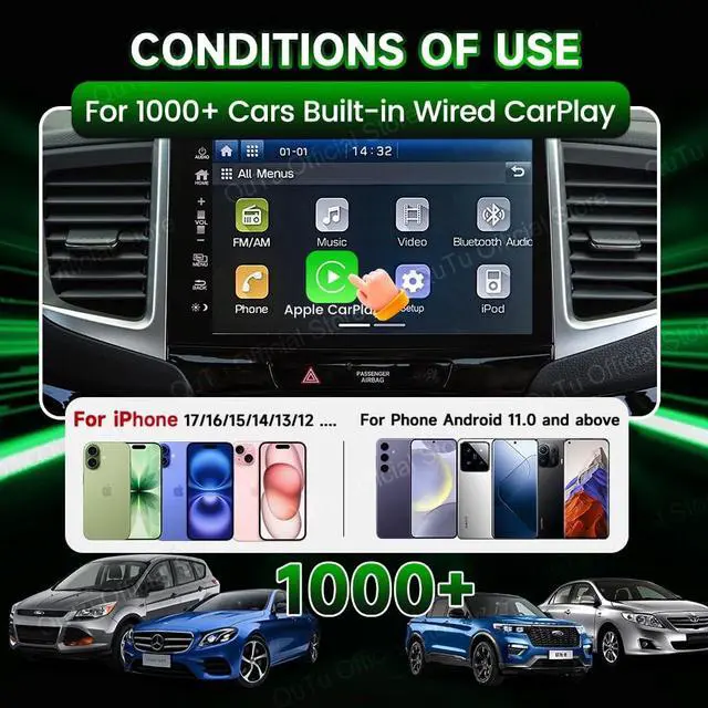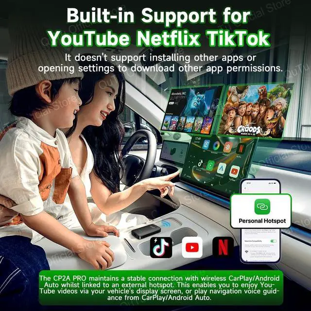 1. Seamless Wireless Conversion Effortlessly upgrades your factory wired CarPlay to wireless CarPlay Android Auto, eliminating cable clutter while maintaining full original functionality. ^^ 2. Built-in Net-flix/You-Tube/Tik-Tok Enjoy a cinematic episode during your lunch break, catch up on the latest viral videos while waiting to pick someone up, or set the mood with music streams on a family trip. ^^ 3. Advanced Android 12.0 Platform Unlocks a full Android 12.0 system with access to extensive apps and services through the built-in platform. ^^ 4. Plug-and-Play Installation Simple USB connection requires no complex wiring or professional installation - just plug in and start using immediately.