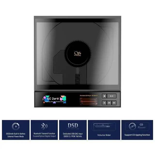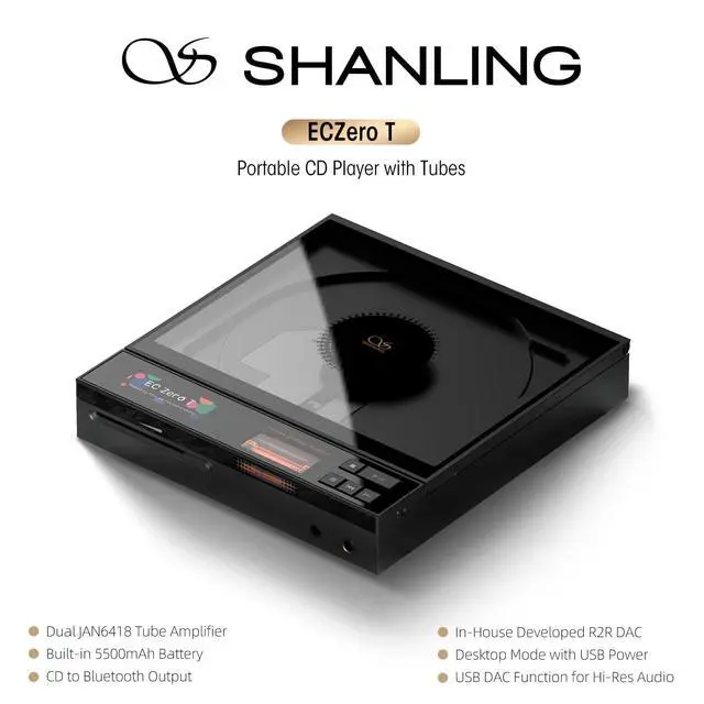 Pioneering Audio Technology Industry-first SHANLING-developed portable CD player combining R2R DAC architecture with dual JAN6418 vacuum tubes. Achieves ultra-high resolution decoding up to 768kHz/32bit and DSD512 for authentic analog sound signature. ^^ Pro Connectivity Options 4.4 mm balanced output delivers 1220mW@32 power with 3.5 mm/coaxial/optical ports. Bluetooth 5.3 transmitter ensures wireless HiFi streaming. USB DAC mode and CD ripping function for personal music archiving. ^^ Portable HiFi Solution 6.25. 91.1 -inch lightweight body (669g) with 5500mAh battery sustains 8-hour playback. Precision sliding volume knob and side lock prevent operational errors during outdoor use.
