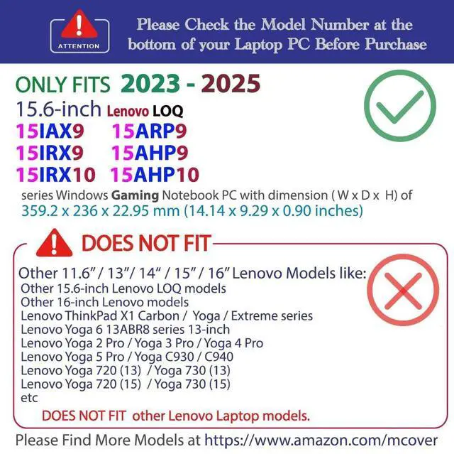 NOTE: Before placing order, PLEASE make sure to verify your laptop model number as this case is MODEL specific and NOT interchangeable. ^^ NOT fitting other 15.6 -inch Lenovo IdeaPad or ThinkPad laptops. NOT compatible with ANY other laptops as well. ^^ Made of high-quality translucent polycarbonate material which is shatter-proof and will protect your 2023 - 2025 15.6" Lenovo LOQ 15IAX9 / 15ARP9 / 15IRX9 / 15AHP9 / 15IRX10 / 15AHP10 series Windows Computers all around ^^ Designed to ONLY fit the 2023 - 2025 15.6" Lenovo LOQ 15IAX9 / 15ARP9 / 15IRX9 / 15AHP9 / 15IRX10 / 15AHP10 series Windows Computers with dimension of 359.86 x 258.7 x 23.9 mm ( 14.17 x 10.19 x 0.94 inches).