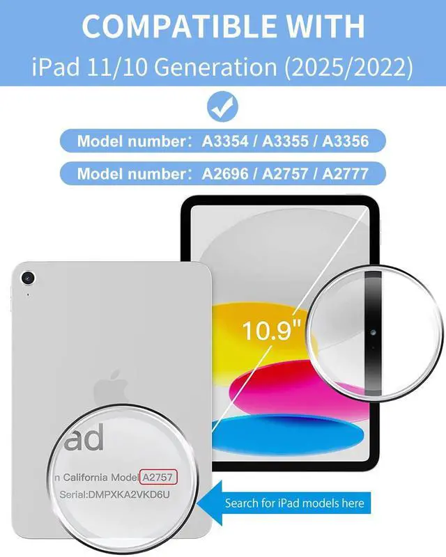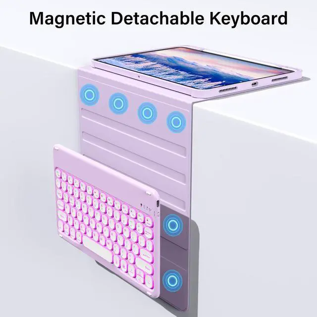 Generation 2022 10.9 inchModel: A2696/A2757/A2777). It is Not compatible with any other devices. Please check back bottom of your iPad to find the model number. ^^ Adjustable 7 Colors & 3 Modes Backlit KeyboardThis iPad keyboard case is designed with 7 different colors and 3 adjustable modes, allowing you to adjust the applicable color to illuminate the keyboard even in dim light for easy typing, you can choose your favorite color and mode, easy to switch to make it more convenient for you to use and bring you a different visual enjoyment. ^^ Multiple Viewing and Pencil Holder Keyboard Case 10.9" -the keyboard is magnetically attached and very versatile and the thoughtful design easily adjusts to whatever comfortable angle suits you best. That makes the IPad work like a laptop, so it's perfect for working, typing and editing or watching videos. It has a pen slot inside to prevent the apple pencil from being lost, grab your Apple Pencil, Pencil Cap and Adapter effortlessly whenever you want, easily to carry your with your device. ^^ Magnetic Detachable Keyboard & Long Life Battery The magnetic for iPad keyboard and case are separated, magnetically attached, the keyboard can be removed from the case.