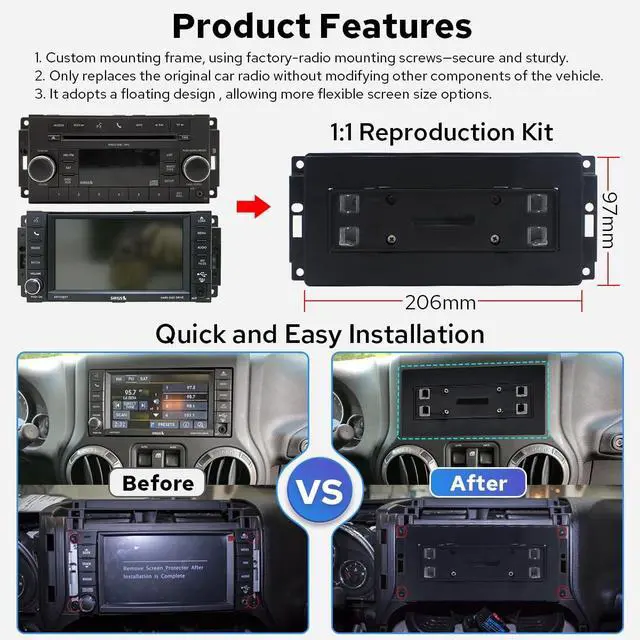 Plug and Play Car StereoNon-destructive installation, can be directly plugged intothe original power cord to use, no need to cut the cable. ^^ Specialized Mounting Surface FramesUse the original car fixed position and screws, safe and secure. Only replace the original car stereo, do not change other parts of the original car. ^^ Floating TouchscreenThe screen is mounted in a floating design, with a more flexible choice of screen sizes. ^^ GPS NavigationPrecise GPS engines, more accurate positioning, including GPS antennas, can better receive satellite signals, thus ensuring faster real-time navigation.