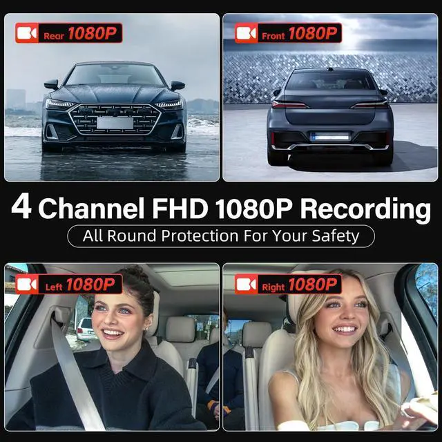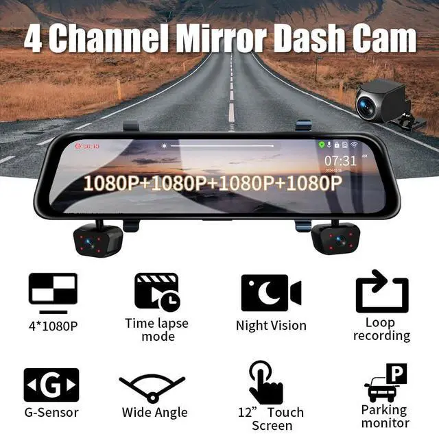 QUAD CHANNEL SYSTEM: 4 Channel Mirror Dash Cam, features simultaneous recording from 4 cameras in crisp 1080P resolution for comprehensive vehicle surveillance. With 170wide angle lens and 12 inches full touch screen provide you provides a wide viewing angle and vibrant colors, allowing you to easily preview and playback your recordings. ^^