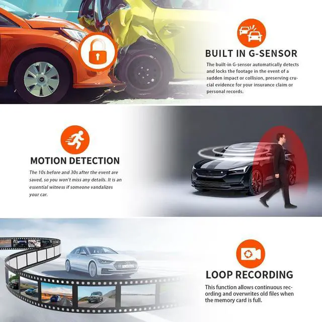 G-sensor Function: The 360-degree mirror dash camera for cars has standard features like G-sensor and loop recording. When the memory card reaches its maximum storage capacity, the oldest unlocked film will be automatically deleted. Loop recording enables for continuous recording. When there are unexpected collisions or impacts, the integrated G-sensor automatically locks and preserves video footage as proof. The locked file won't be overwritten by loop recording.
