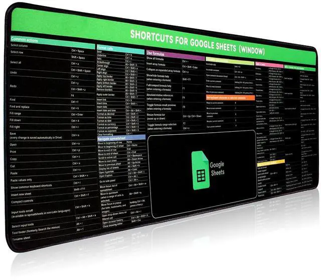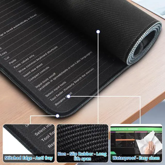 Google Sheet ShortcutThe Large mouse pad with shortcuts specifically designed for Google Sheets, making it easy for you to use Google Docs and improve work efficiency. ^^ HD PrintingThe extra large Google sheet shortcut mousepad adopts high-tech printing process to ensure that the pattern of the mouse pad is clear and the color is bright. Ensuring users have quick and easy access to frequently used commands and functions. This is a great office accessories. ^^ Universal FitMouse Pad for Desk is designed for comfort and productivity. Measuring at 31.5 x 11.8 inches, it provides ample space to accommodate your mouse, keyboard, and other desk essentials.