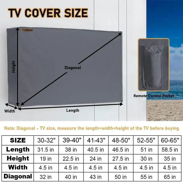 FOR MOST 41-43" TVS- 40.5"L 24"H 4.5"W, DIAGONAL LENGTH=SIZE OF TV=43". The size gives allowance to cover tv stand, digibox and sound bar. Please measure the outside dimensions of the TV including the frame before purchasing to ensure compatibility. Fits most brands of LCD, LED and Plasma displays. ^^ 600D HIGH QUALITY OXFORDOutdoor TV Cover is made of high quality 600D Oxford cloth, which is resistant to snow, rain, dust and wind, providing year-round protection in any extreme weather. Rugged and durable, protects your TV from water and surface scratches, extending the life of your outdoor TV.